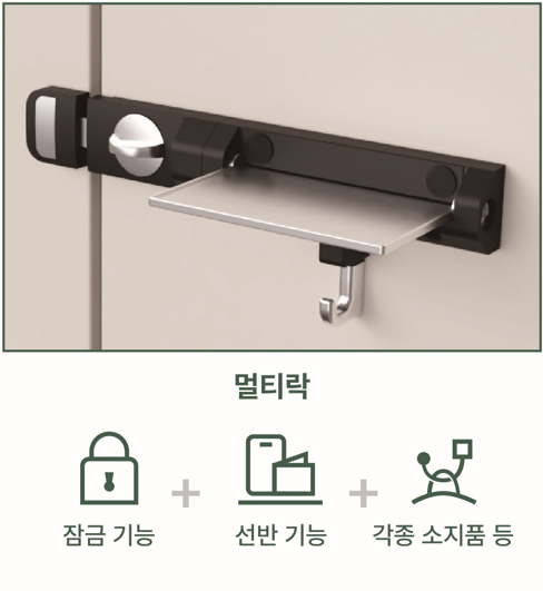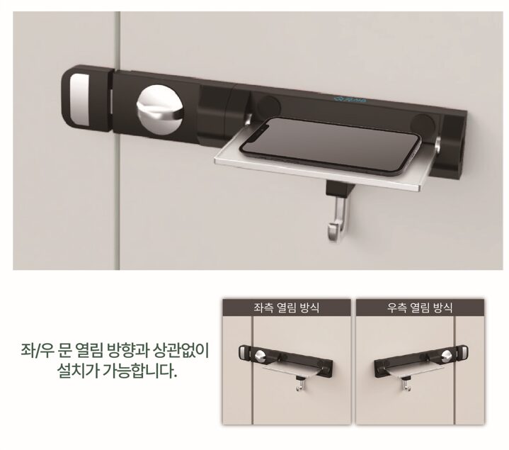 화장실 도어락과 선반기능을 결합한 제품으로, 화장실 분실 사고를 방지하기 위해 만들어진 특허 제품입니다. 단순한 선반이 아닌 화장실 잠금장치와 연동하여 자동으로 선반이 접고 펼쳐지는 제품으로, 뛰어난 디자인과 다양한 기능로 사용자들에게 보다 높은 수준의 화장실 경험을 제공합니다.
